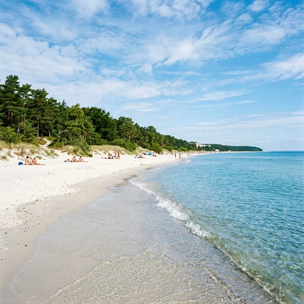 Beautiful natural FKK nudist beach at Prora North FKK in Rügen Germany, peaceful lake with crystal clear water, sandy shore, surrounded by green forest. Highly recommended for a genuine local experience. The community is welcoming and body-positive.
